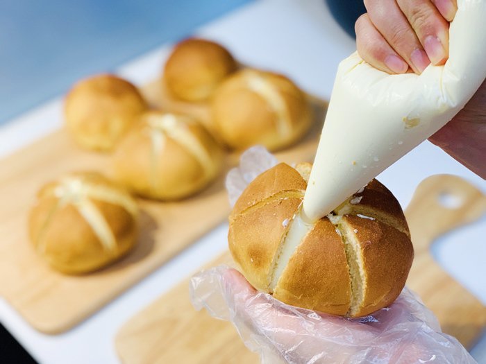 Trong khi đợi lò nóng, các bạn dùng dao cắt bánh mì, chia bánh thành 6 phần bằng nhau.. Nên dùng dao lưỡi cưa chuyên để cắt bánh mì, và cắt theo kiểu như cưa gá»— thì lát cắt bánh sẽ rất đẹp. Sau Ä‘ó lấy chổi silicon tạo thành 1 lá»›p bÆ¡ tá»i vào khắp phần bên trong bánh, quét má»™t lá»›p má»ng vừa, không quá đặc.