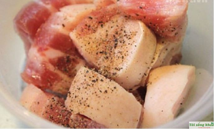 - Äầu tiên, hãy bắt đầu sÆ¡ chế thịt. Thịt sau khi Ä‘ã rá»a sạch, dùng dao cạo nhẹ phần da để loại bá» lông và những chất bẩn. Sau Ä‘ó, ngâm thịt trong nước muối từ 15 đến 20 phút để khá» mồ hôi cá»§a thịt.