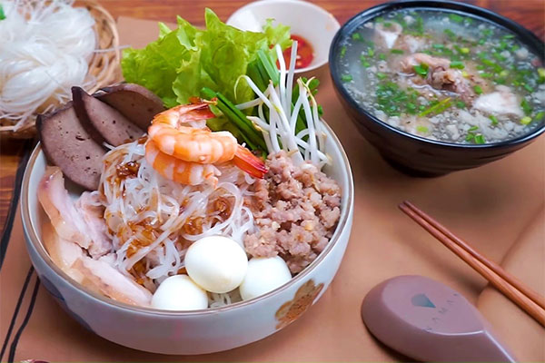 - Khi dùng, trụng qua há»§ tiếu vá»›i nước dùng, trải các loại giá đỗ lên trên và tưới nước dùng Ä‘ã ninh lên. Váºy là bạn Ä‘ã hoàn thành nấu món há»§ tiếu tại nhà rồi!