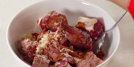 Sau Ä‘ó bạn cho gân bò vào há»—n hợp gia vị Ä‘ã chuẩn bị và Æ°á»›p trong khoảng 1 tiếng cho gia vị ngấm Ä‘á»u nhé!