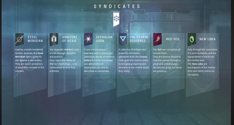 Syndicates are factions within the Warframe universe, each with its own ideologies, goals, and rewards.